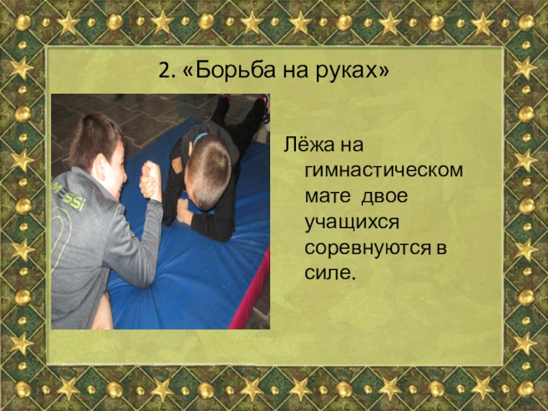2. «Борьба на руках»Лёжа на гимнастическом мате двое учащихся соревнуются в силе.