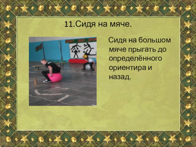 11.Сидя на мяче.  Сидя на большом мяче прыгать до определённого ориентира и назад.