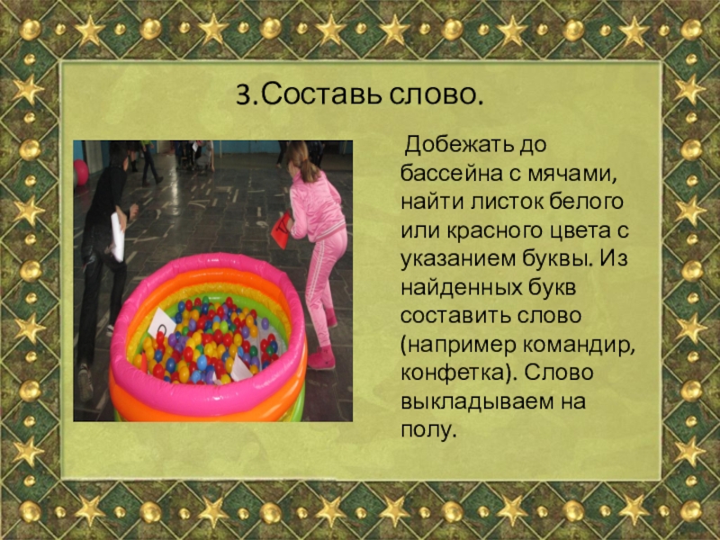 3.Составь слово.   Добежать до бассейна с мячами, найти листок белого или красного цвета с указанием