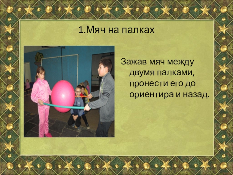 1.Мяч на палкахЗажав мяч между двумя палками, пронести его до ориентира и назад.