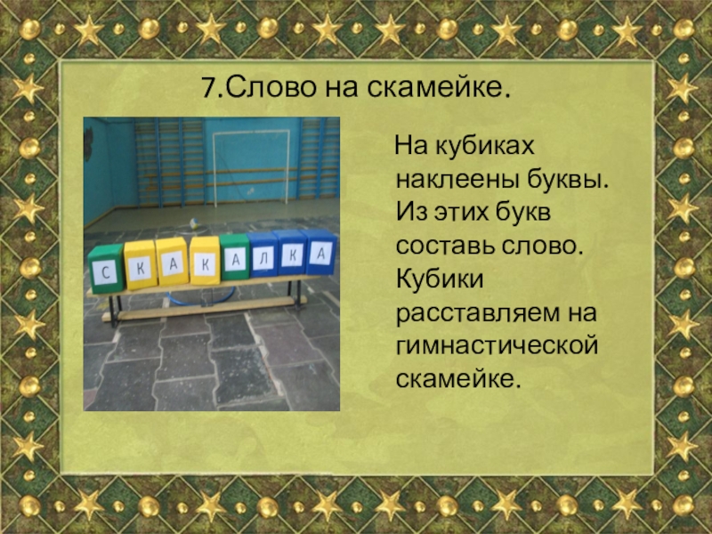 7.Слово на скамейке.  На кубиках наклеены буквы. Из этих букв составь слово. Кубики расставляем на гимнастической