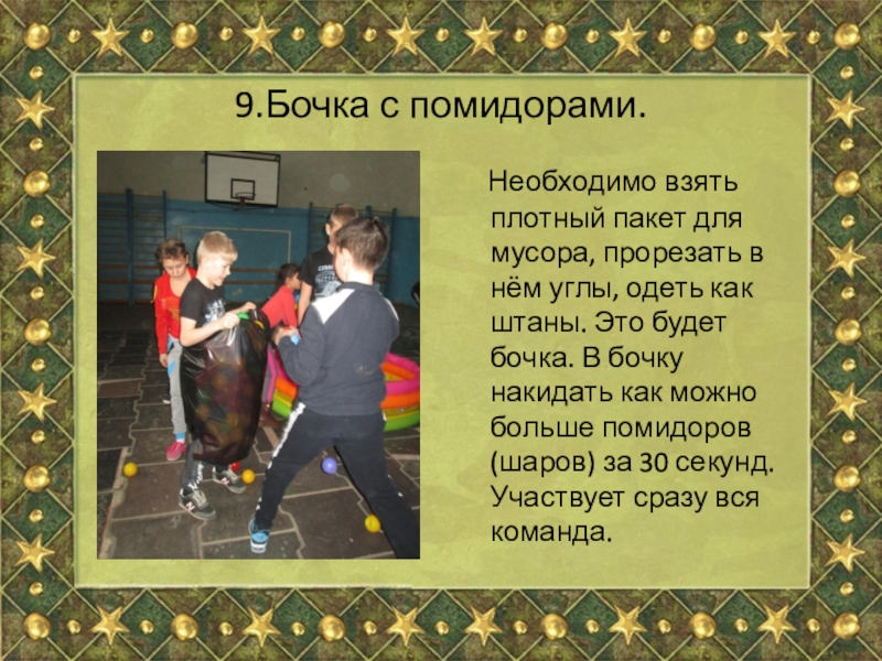 в нём углы, одеть как штаны. Это будет бочка. В бочку накидать как можно больше помидоров (шаров) за 30 секунд. Участвует сразу вся команда.