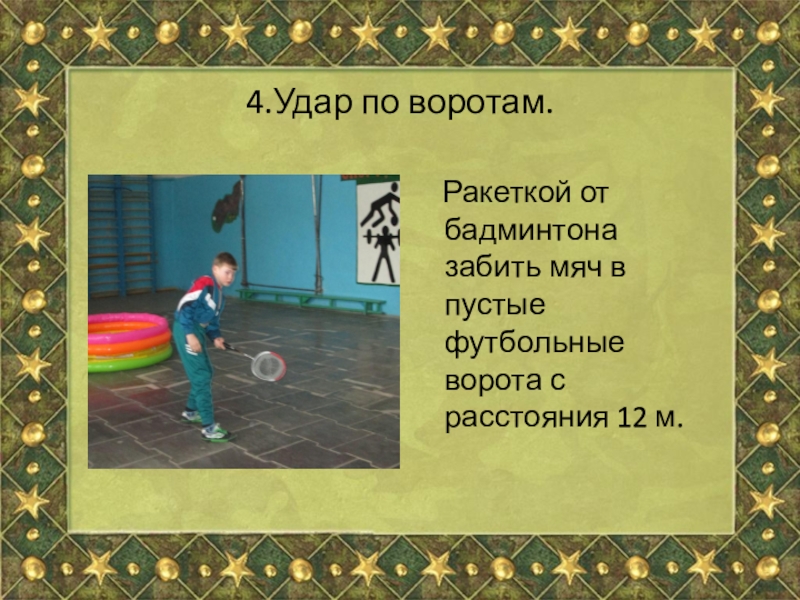 4.Удар по воротам.  Ракеткой от бадминтона забить мяч в пустые футбольные ворота с расстояния 12 м.