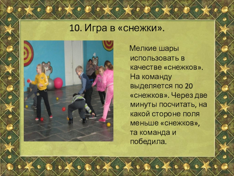 10. Игра в «снежки».  Мелкие шары использовать в качестве «снежков». На команду выделяется по 20 «снежков».