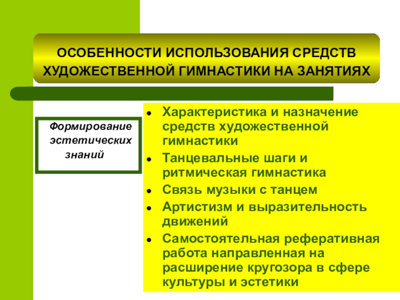 Слайд 23ОСОБЕННОСТИ ИСПОЛЬЗОВАНИЯ СРЕДСТВ ХУДОЖЕСТВЕННОЙ ГИМНАСТИКИ НА ЗАНЯТИЯХ
