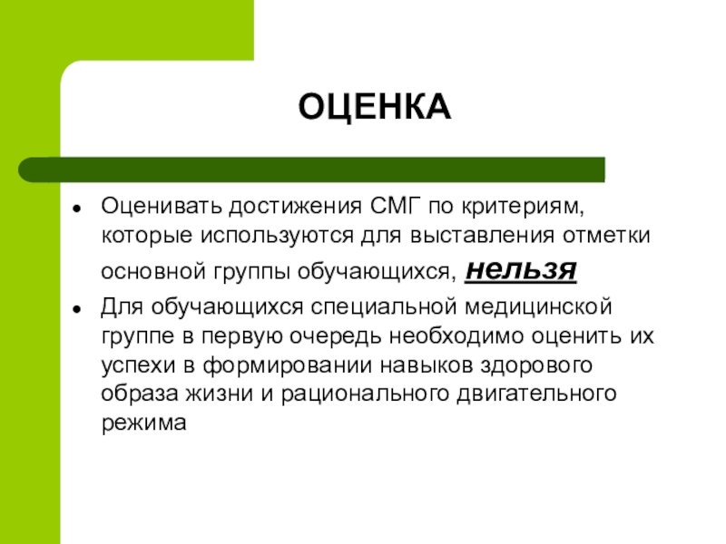 Для обучающихся специальной медицинской группе в первую очередь необходимо оценить их успехи в формировании навыков здорового образа жизни и рационального двигательного режима