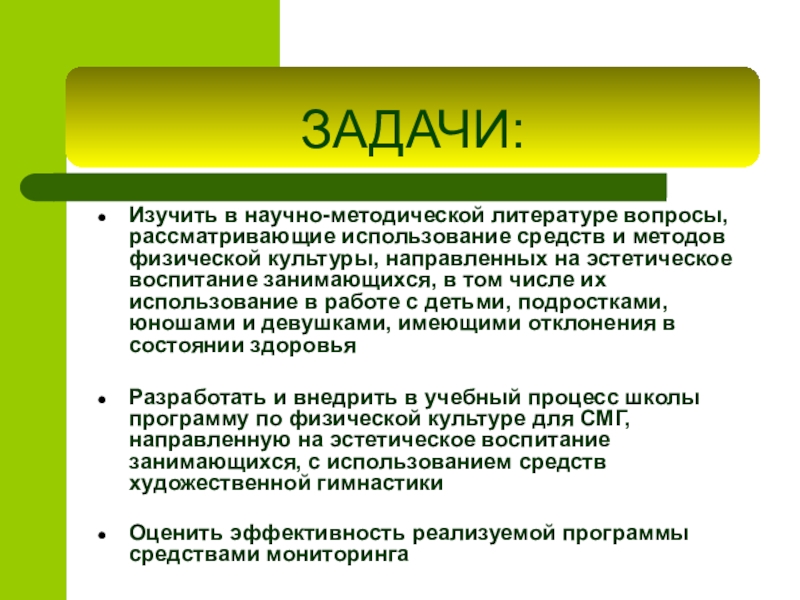Разработать и внедрить в учебный процесс школы программу по физической культуре для СМГ, направленную на эстетическое воспитание занимающихся, с использованием средств художественной гимнастики