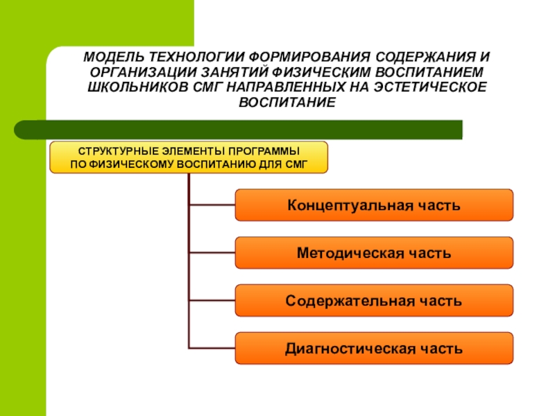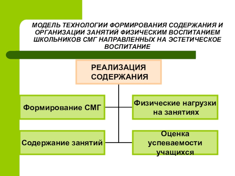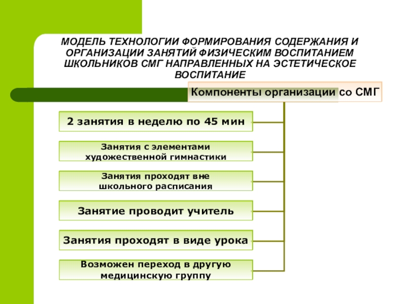 Слайд 14МОДЕЛЬ ТЕХНОЛОГИИ ФОРМИРОВАНИЯ СОДЕРЖАНИЯ И ОРГАНИЗАЦИИ ЗАНЯТИЙ ФИЗИЧЕСКИМ ВОСПИТАНИЕМ ШКОЛЬНИКОВ СМГ