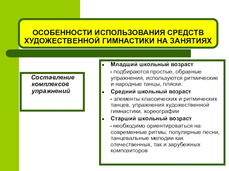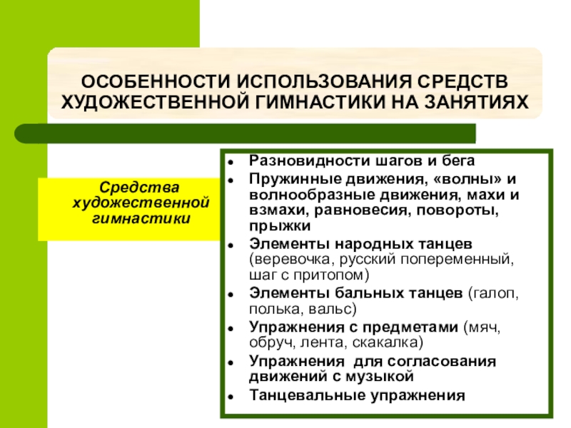 Слайд 21ОСОБЕННОСТИ ИСПОЛЬЗОВАНИЯ СРЕДСТВ ХУДОЖЕСТВЕННОЙ ГИМНАСТИКИ НА ЗАНЯТИЯХ