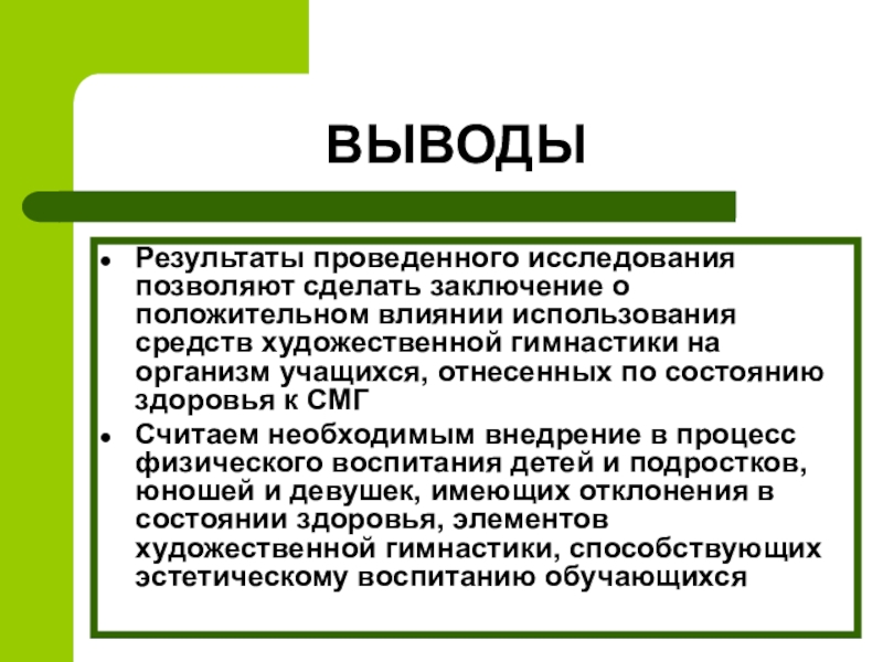 Считаем необходимым внедрение в процесс физического воспитания детей и подростков, юношей и девушек, имеющих отклонения в состоянии здоровья, элементов художественной гимнастики, способствующих эстетическому воспитанию обучающихся