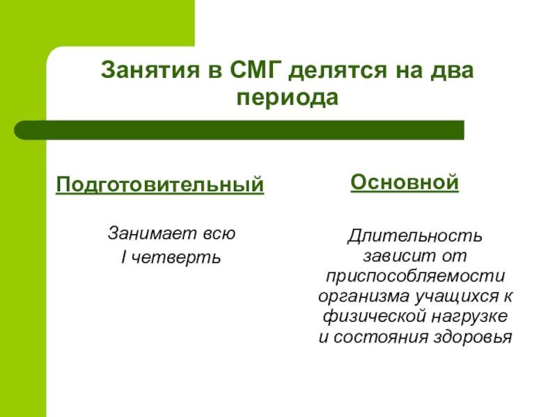 Слайд 18Занятия в СМГ делятся на два периода