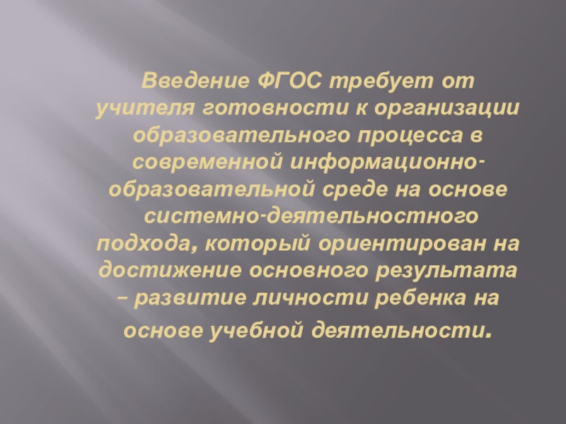Слайд 18Введение ФГОС требует от учителя готовности к организации образовательного процесса в
