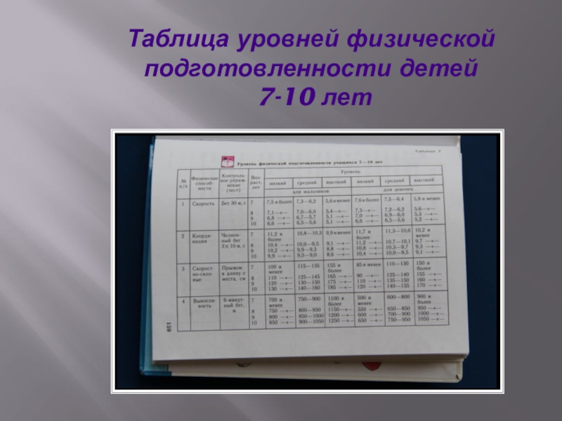 Слайд 14Таблица уровней физической подготовленности детей