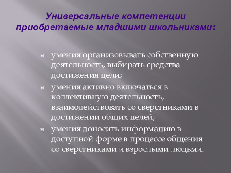 Слайд 4Универсальные компетенции приобретаемые младшими школьниками: