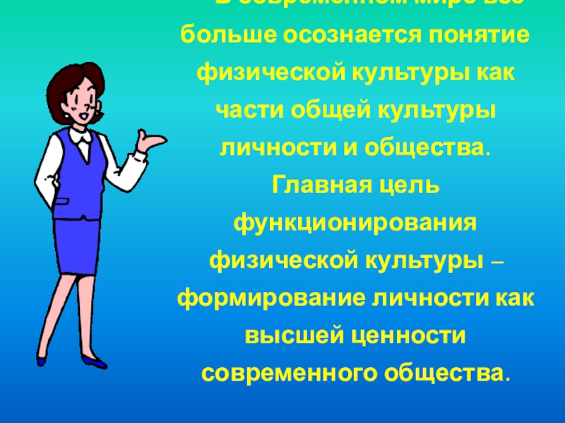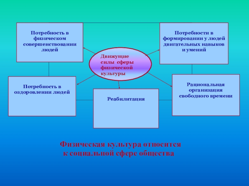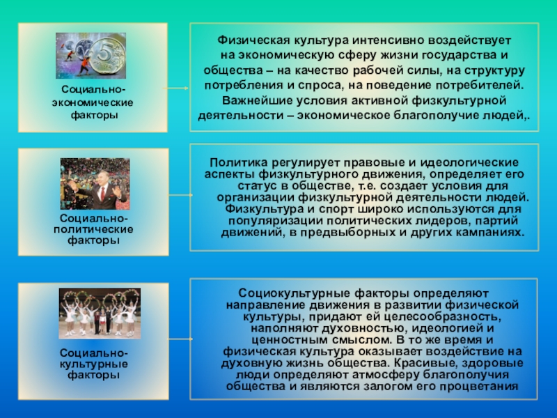 Социокультурные факторы определяют направление движения в развитии физической культуры, придают ей целесообразность, наполняют духовностью, идеологией и ценностным смыслом. В то же время и физическая культура оказывает воздействие на духовную жизнь общества. Красивые, здоровые люди определяют атмосферу благополучия общества и являются залогом его процветания
