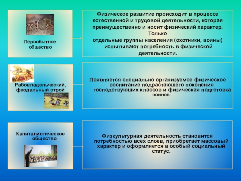 Появляется специально организуемое физическое воспитание подрастающего поколения господствующих классов и физическая подготовка воинов.
