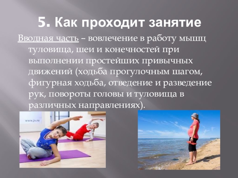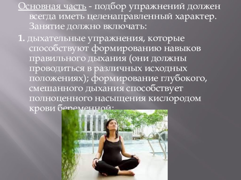 1. дыхательные упражнения, которые способствуют формированию навыков правильного дыхания (они должны проводиться в различных исходных положениях); формирование глубокого, смешанного дыхания способствует полноценного насыщения кислородом крови беременной;