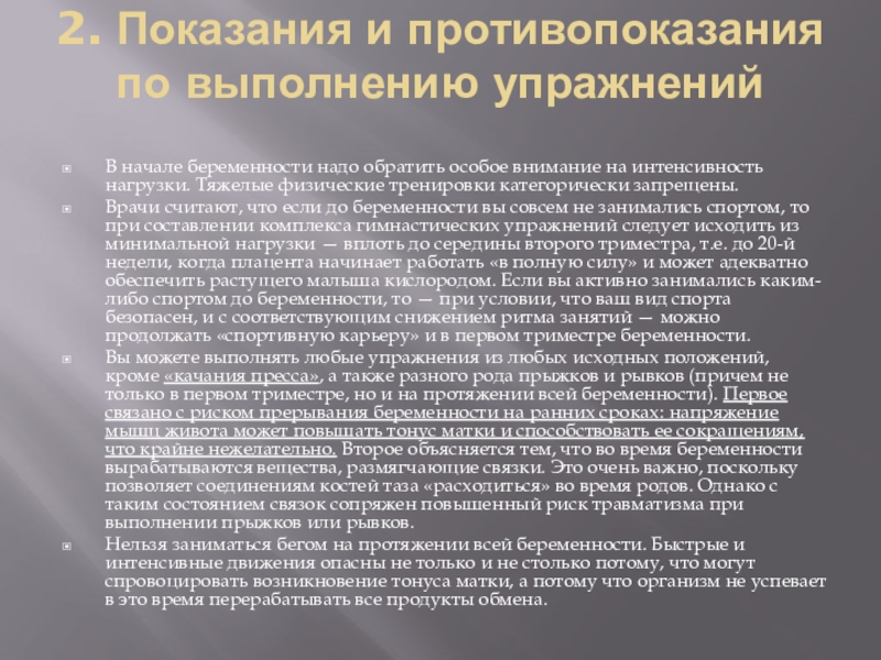 Слайд 8Противопоказания к применению физических упражнений во время беременности: