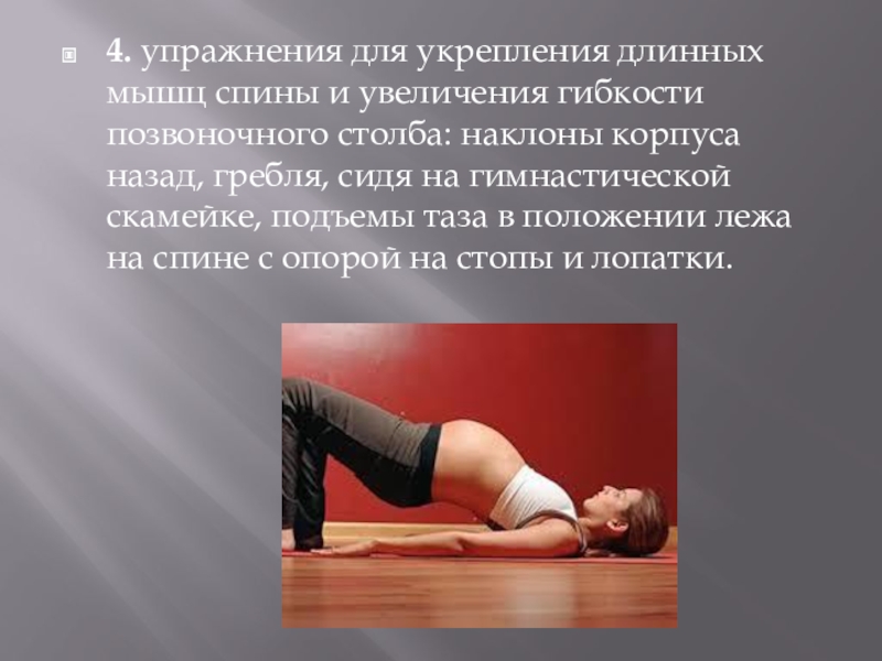 наклоны корпуса назад, гребля, сидя на гимнастической скамейке, подъемы таза в положении лежа на спине с опорой на стопы и лопатки.