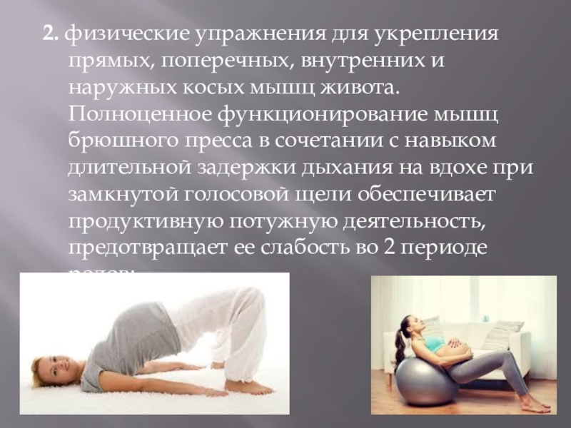 живота. Полноценное функционирование мышц брюшного пресса в сочетании с навыком длительной задержки дыхания на вдохе при замкнутой голосовой щели обеспечивает продуктивную потужную деятельность, предотвращает ее слабость во 2 периоде родов;