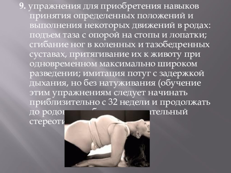 в родах: подъем таза с опорой на стопы и лопатки; сгибание ног в коленных и тазобедренных суставах, притягивание их к животу при одновременном максимально широком разведении; имитация потуг с задержкой дыхания, но без натуживания (обучение этим упражнениям следует начинать приблизительно с 32 недели и продолжать до родов, вырабатывая двигательный стереотип).
