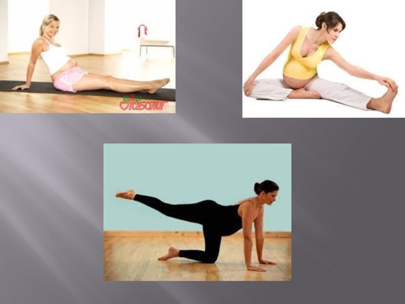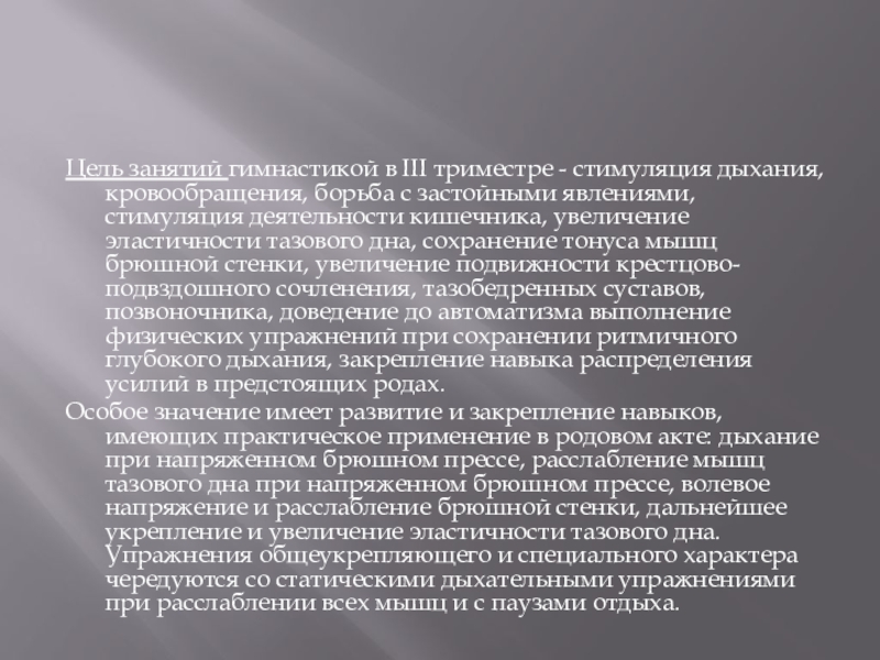 Слайд 16Цель занятий гимнастикой в ІІІ триместре - стимуляция дыхания, кровообращения, борьба с