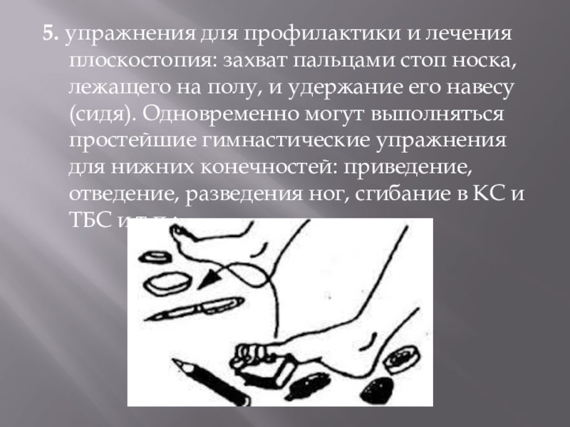 Слайд 235. упражнения для профилактики и лечения плоскостопия: захват пальцами стоп носка, лежащего