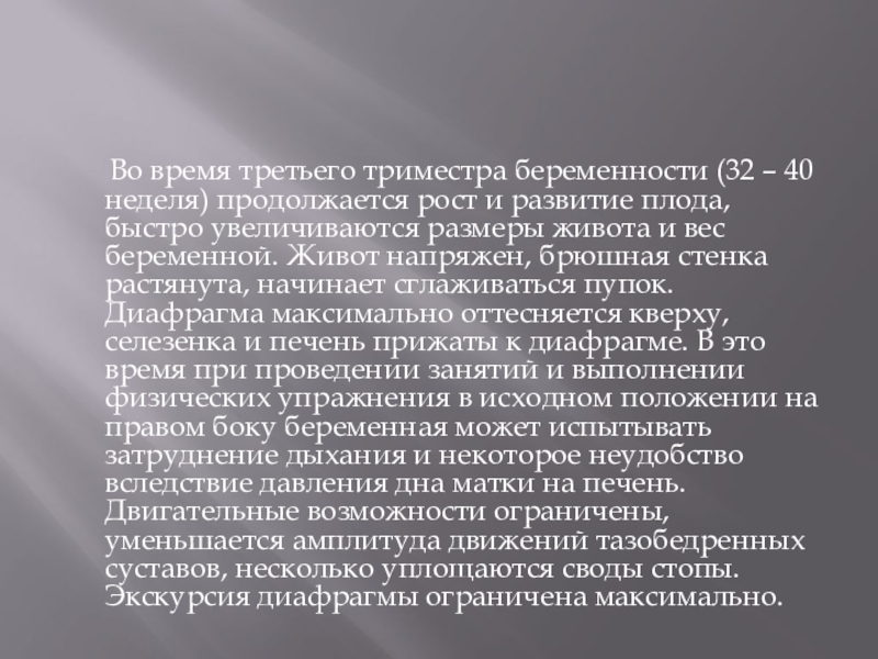 неделя) продолжается рост и развитие плода, быстро увеличиваются размеры живота и вес беременной. Живот напряжен, брюшная стенка растянута, начинает сглаживаться пупок. Диафрагма максимально оттесняется кверху, селезенка и печень прижаты к диафрагме. В это время при проведении занятий и выполнении физических упражнения в исходном положении на правом боку беременная может испытывать затруднение дыхания и некоторое неудобство вследствие давления дна матки на печень. Двигательные возможности ограничены, уменьшается амплитуда движений тазобедренных суставов, несколько уплощаются своды стопы. Экскурсия диафрагмы ограничена максимально.