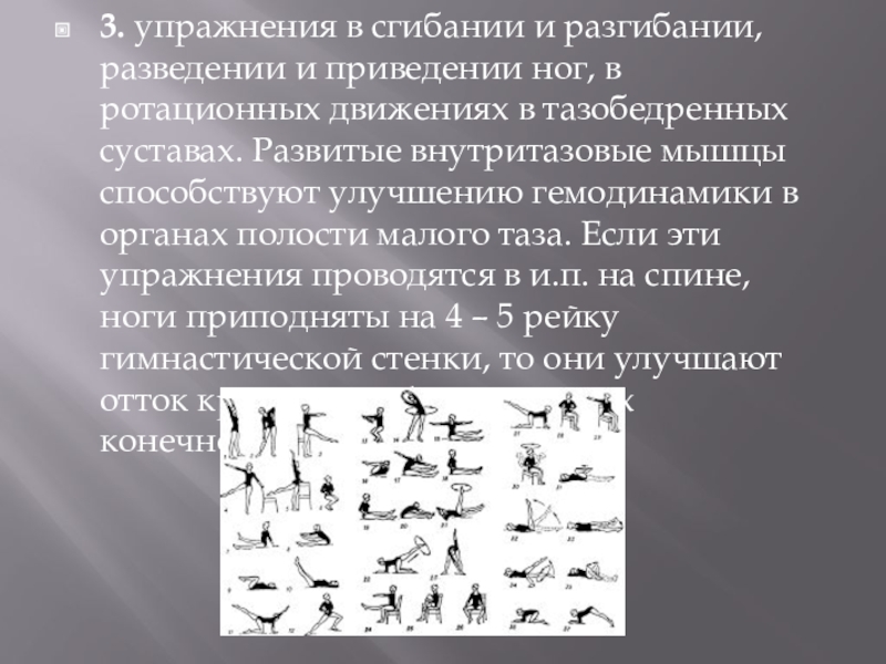 движениях в тазобедренных суставах. Развитые внутритазовые мышцы способствуют улучшению гемодинамики в органах полости малого таза. Если эти упражнения проводятся в и.п. на спине, ноги приподняты на 4 – 5 рейку гимнастической стенки, то они улучшают отток крови и лимфы от нижних конечностей;