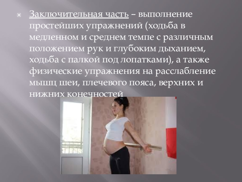 Слайд 28Заключительная часть – выполнение простейших упражнений (ходьба в медленном и среднем темпе