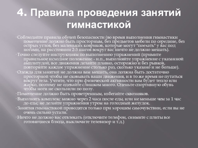 · Занятия гимнастикой проводятся только при хорошем самочувствии, если вы не очень сильно устали.