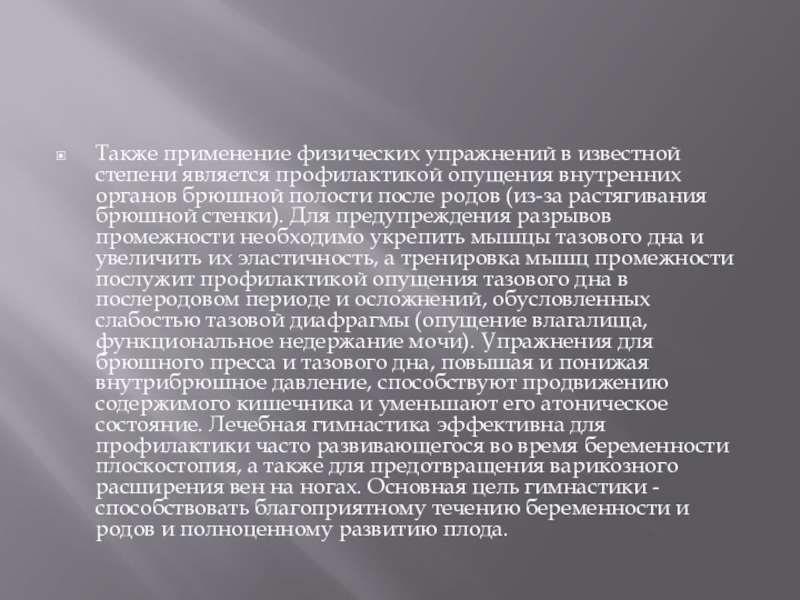 органов брюшной полости после родов (из-за растягивания брюшной стенки). Для предупреждения разрывов промежности необходимо укрепить мышцы тазового дна и увеличить их эластичность, а тренировка мышц промежности послужит профилактикой опущения тазового дна в послеродовом периоде и осложнений, обусловленных слабостью тазовой диафрагмы (опущение влагалища, функциональное недержание мочи). Упражнения для брюшного пресса и тазового дна, повышая и понижая внутрибрюшное давление, способствуют продвижению содержимого кишечника и уменьшают его атоническое состояние. Лечебная гимнастика эффективна для профилактики часто развивающегося во время беременности плоскостопия, а также для предотвращения варикозного расширения вен на ногах. Основная цель гимнастики - способствовать благоприятному течению беременности и родов и полноценному развитию плода.
