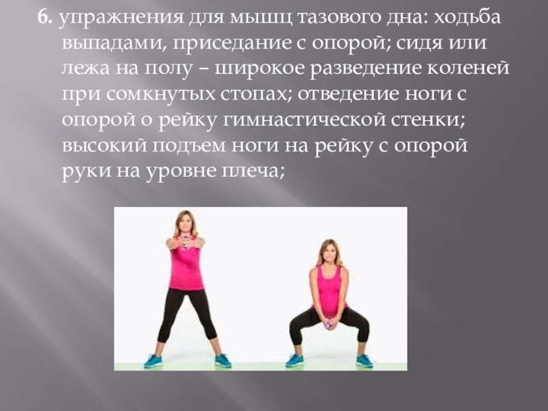 Слайд 246. упражнения для мышц тазового дна: ходьба выпадами, приседание с опорой; сидя