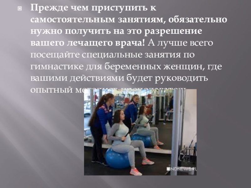 разрешение вашего лечащего врача! А лучше всего посещайте специальные занятия по гимнастике для беременных женщин, где вашими действиями будет руководить опытный методист-преподаватель.