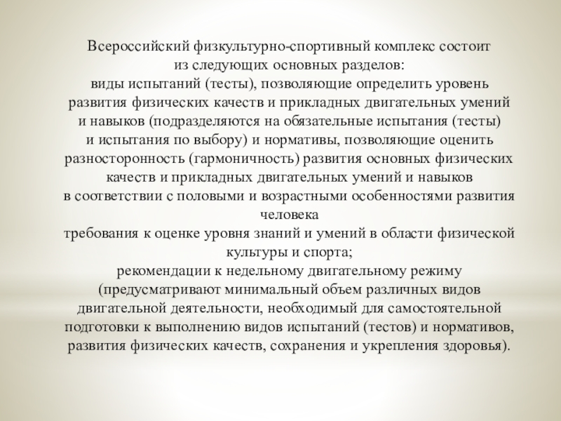 Слайд 58Всероссийский физкультурно-спортивный комплекс состоит из следующих основных разделов:
