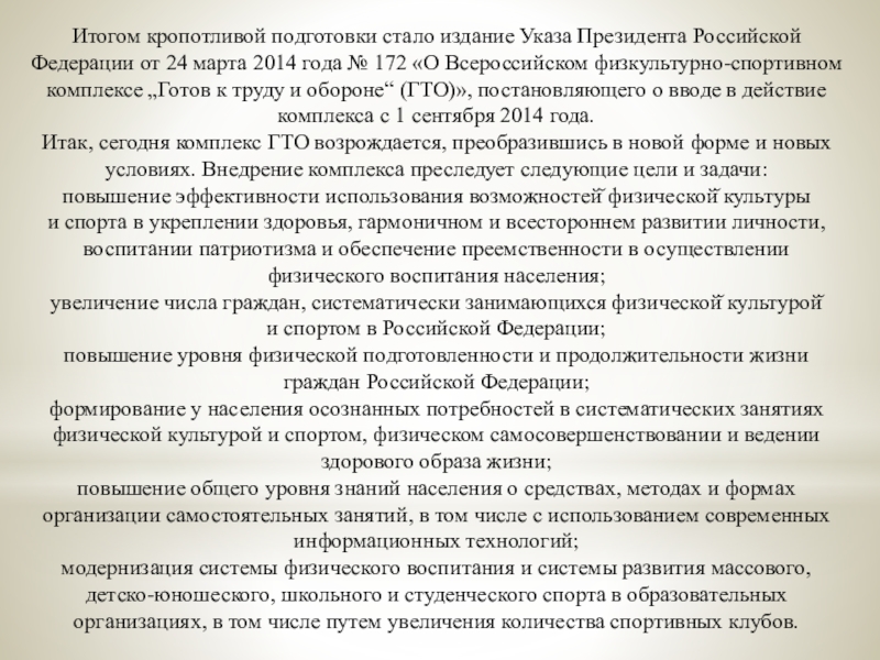 года № 172 «О Всероссийском физкультурно-спортивном комплексе „Готов к труду и обороне“ (ГТО)», постановляющего о вводе в действие комплекса с 1 сентября 2014 года.