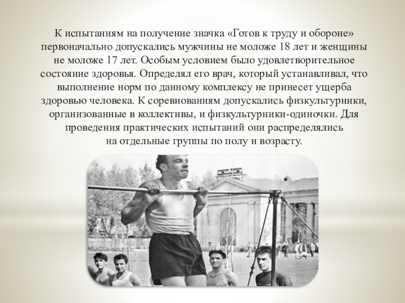 Слайд 11К испытаниям на получение значка «Готов к труду и обороне» первоначально допускались мужчины не моложе 18 лет