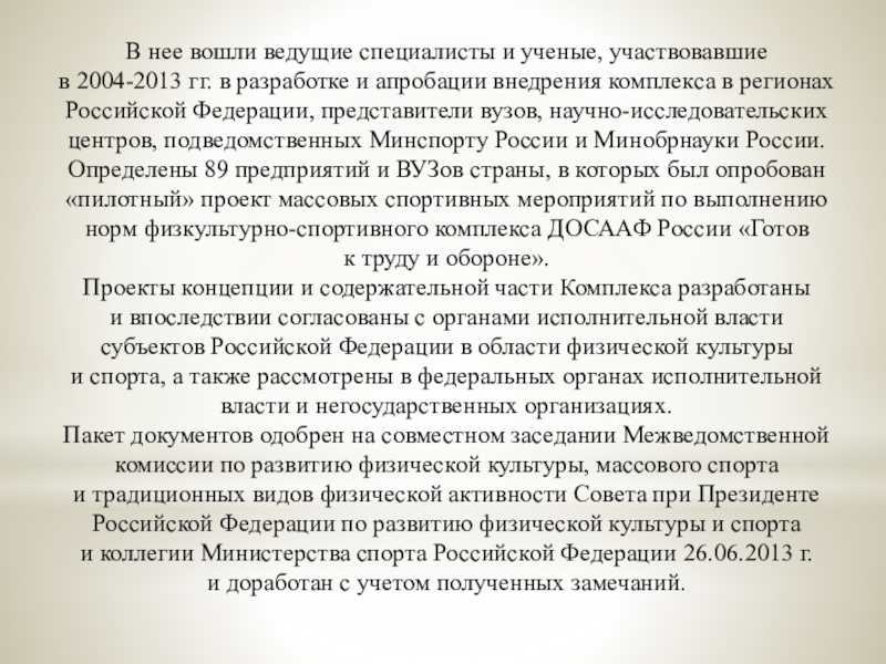 Пакет документов одобрен на совместном заседании Межведомственной комиссии по развитию физической культуры, массового спорта и традиционных видов физической активности Совета при Президенте Российской Федерации по развитию физической культуры и спорта и коллегии Министерства спорта Российской Федерации 26.06.2013 г. и доработан с учетом полученных замечаний.
