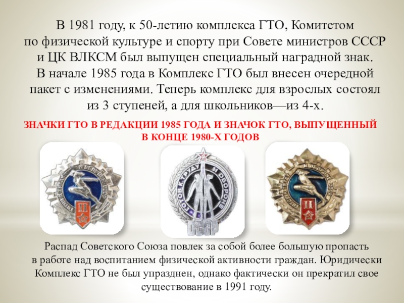 Слайд 23ОСНОВНЫЕ ИЗМЕНЕНИЯ ВСЕСОЮЗНОГО ФИЗКУЛЬТУРНОГО КОМПЛЕКСА «ГОТОВ К ТРУДУ И ОБОРОНЕ СССР» (ГТО)