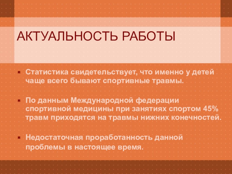 По данным Международной федерации спортивной медицины при занятиях спортом 45% травм приходятся на травмы нижних конечностей.