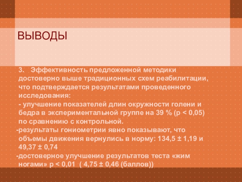 3. Эффективность предложенной методики достоверно выше традиционных схем реабилитации, что подтверждается результатами