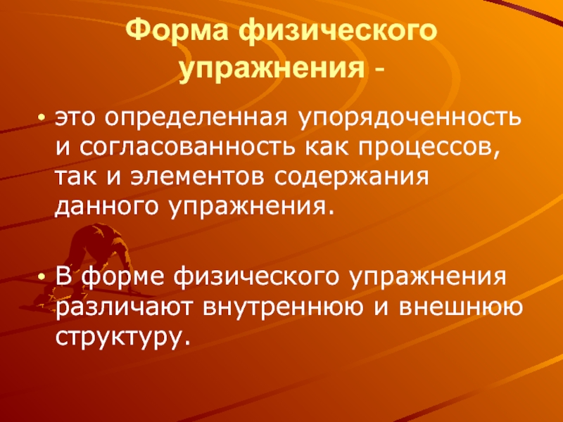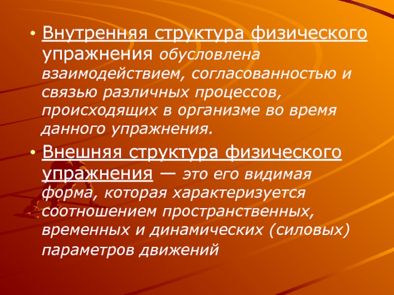 Слайд 10Внутренняя структура физического упражнения обусловлена взаимодействием, согласованностью и связью различных процессов,