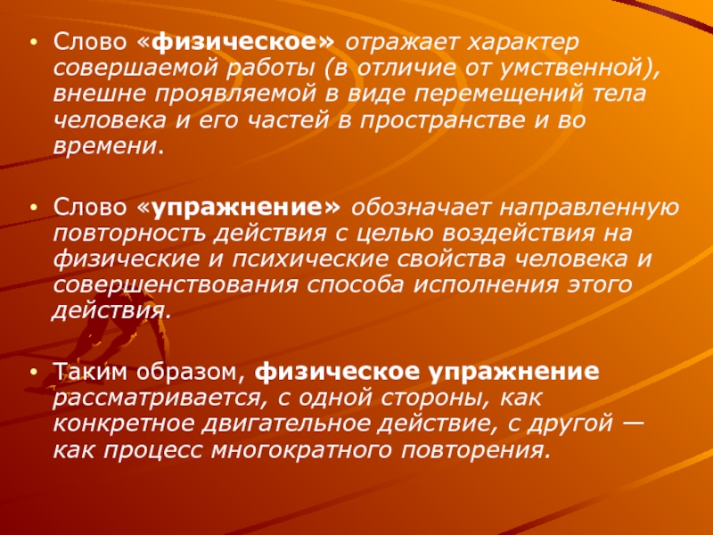 Слайд 4Слово «физическое» отражает характер совершаемой работы (в отличие от умственной), внешне