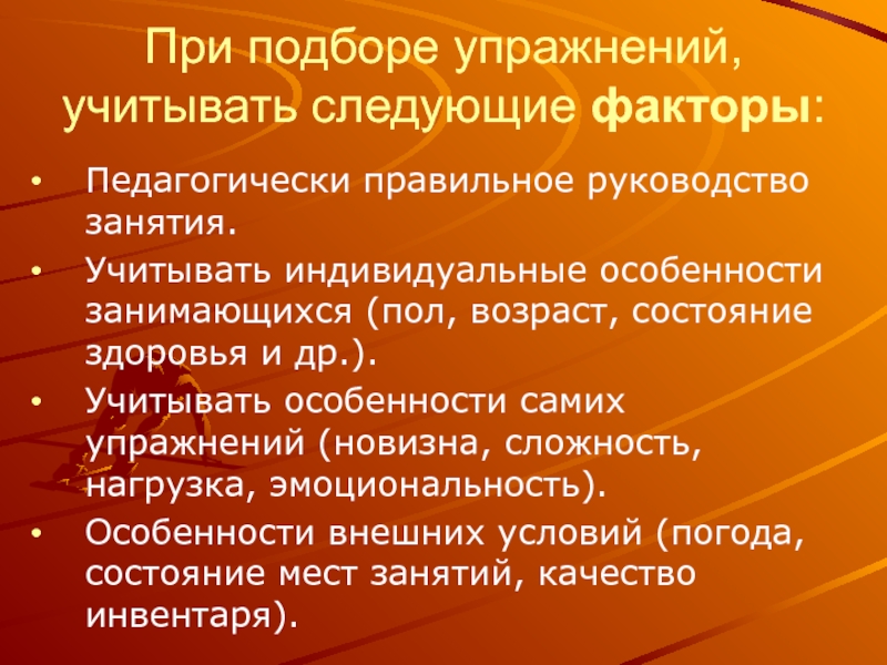 Слайд 6При подборе упражнений, учитывать следующие факторы: