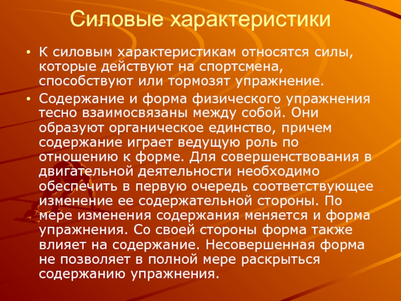 К силовым характеристикам относятся силы, которые действуют на спортсмена, способствуют