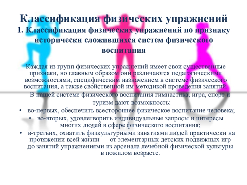 в-третьих, охватить физкультурными занятиями людей практически на протяжении всей жизни — от элементарных детских подвижных игр до занятий упражнениями из арсенала лечебной физической культуры в пожилом возрасте.