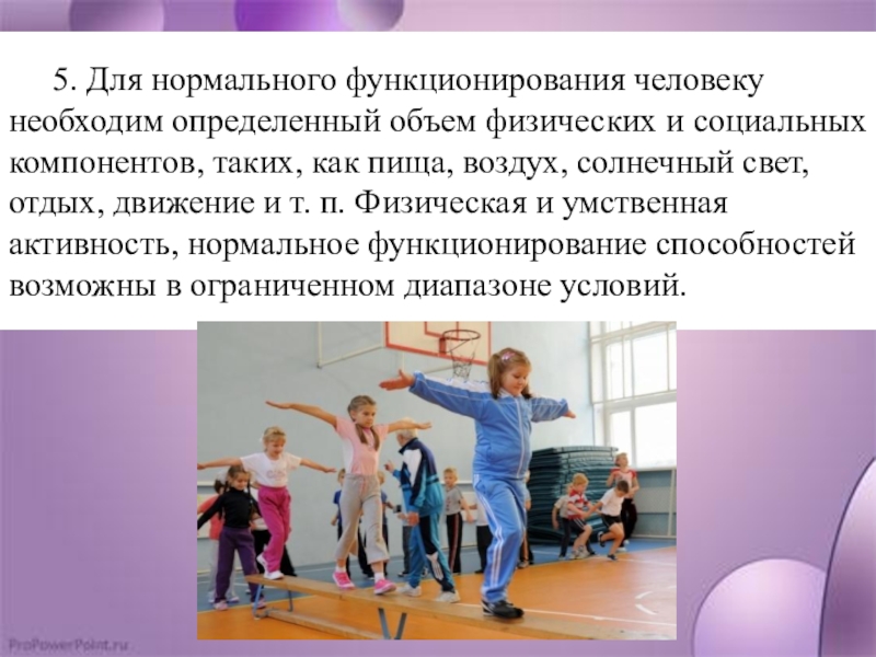 5. Для нормального функционирования человеку необходим определенный объем физических и социальных компонентов, таких, как пища, воздух, солнечный