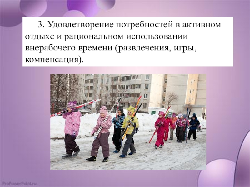 3. Удовлетворение потребностей в активном отдыхе и рациональном использовании внерабочего времени (развлечения, игры, компенсация).