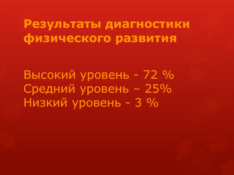 Результаты диагностики физического развития Высокий уровень - 72 % Средний уровень – 25% Низкий уровень -