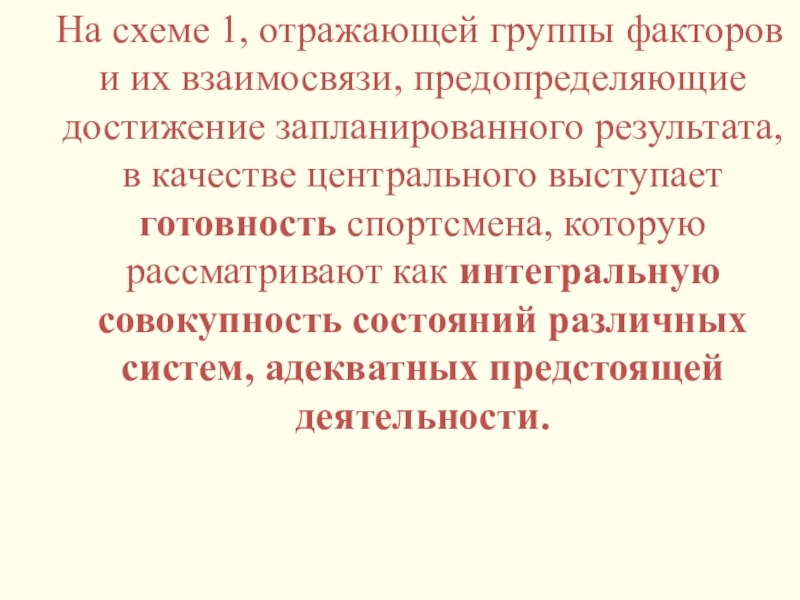 предопределяющие достижение запланированного результата, в качестве центрального выступает готовность спортсмена, которую рассматривают как интегральную совокупность состояний различных систем, адекватных предстоящей деятельности.